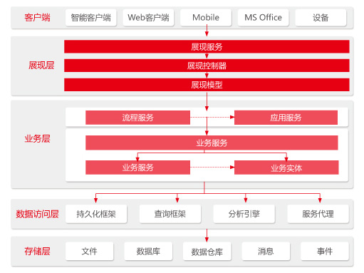 NC6產(chǎn)品的技術(shù)架構(gòu)采用分層體系結(jié)構(gòu),自下而上包括了存儲(chǔ)層、數(shù)據(jù)訪問(wèn)層、業(yè)務(wù)層、展現(xiàn)層和客戶端。