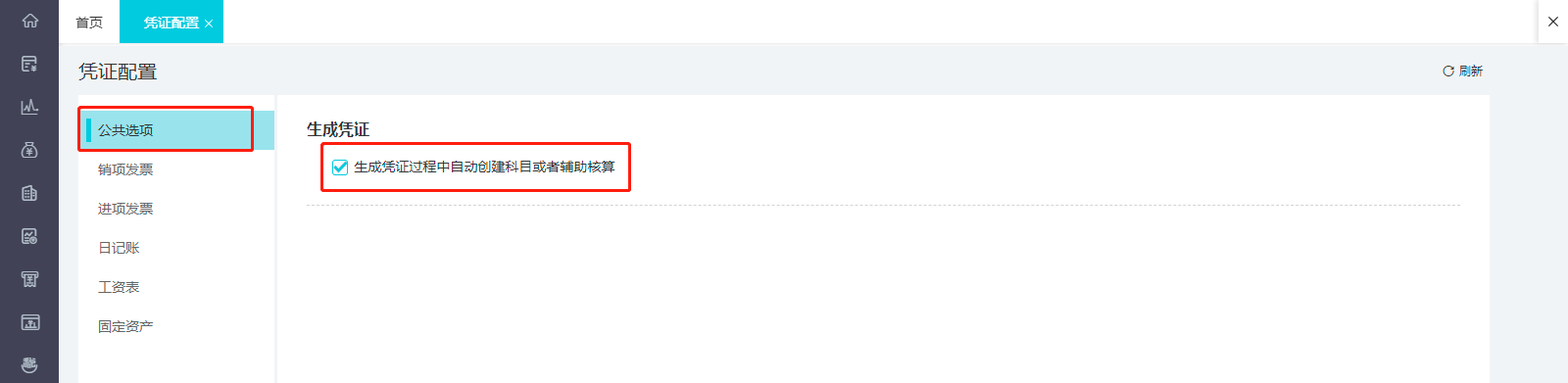 3.對于帶明細科目或者帶輔助核算的一級科目,可以在【設置】-【憑證配置】-【公共選項】勾選 “生成憑證過程中自動創(chuàng)建科目或者輔助核算”,像應收賬款可能會有多個客戶輔助核算項目或者明細科目,勾選此功能以后,生成憑證時會自動創(chuàng)建這家客戶的會計科目,無需我們手動創(chuàng)建。